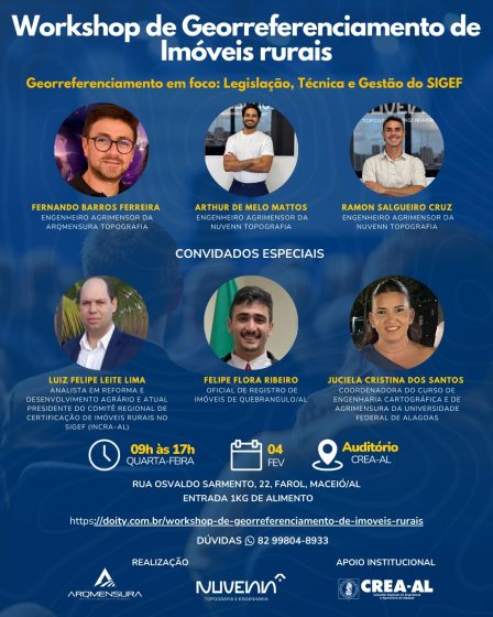 O Workshop de Georreferenciamento de Imóveis Rurais promoverá um dia de imersão técnica com foco em legislação, práticas profissionais e gestão do SIGEF, reunindo engenheiros agrimensores e convidados com ampla experiência na área. O evento estimula a troca de conhecimentos e o aperfeiçoamento profissional, abordando temas essenciais para a regularização e a segurança jurídica dos imóveis rurais.